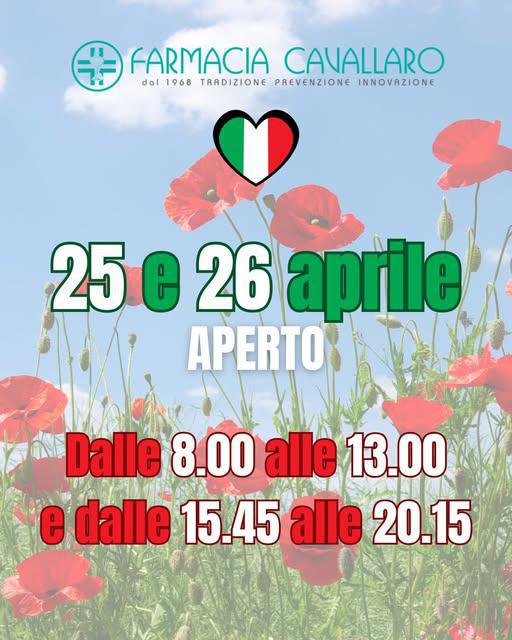 La Farmacia Cavallaro sarร aperta per turno nei giorni 25 e 26 aprile, per garantirvi assistenza anche durante le festivitร ๐โจ